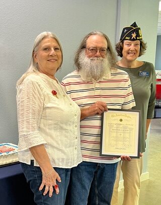 Royston J. (Joe) Guidry receives his 50 year “Certificate of Continuous Membership” from Post 352 Commander, Kathie Bowman Estrada at the April 16th meeting. An Army Veteran, Joe served in the 814th Eng Float Bridge Company as a Company Clerk-SP4, in Hanau, Germany. He joined the American Legion a few years after his release from active duty on March 19, 1973. It was a special evening for Joe and his wife, Vicki.